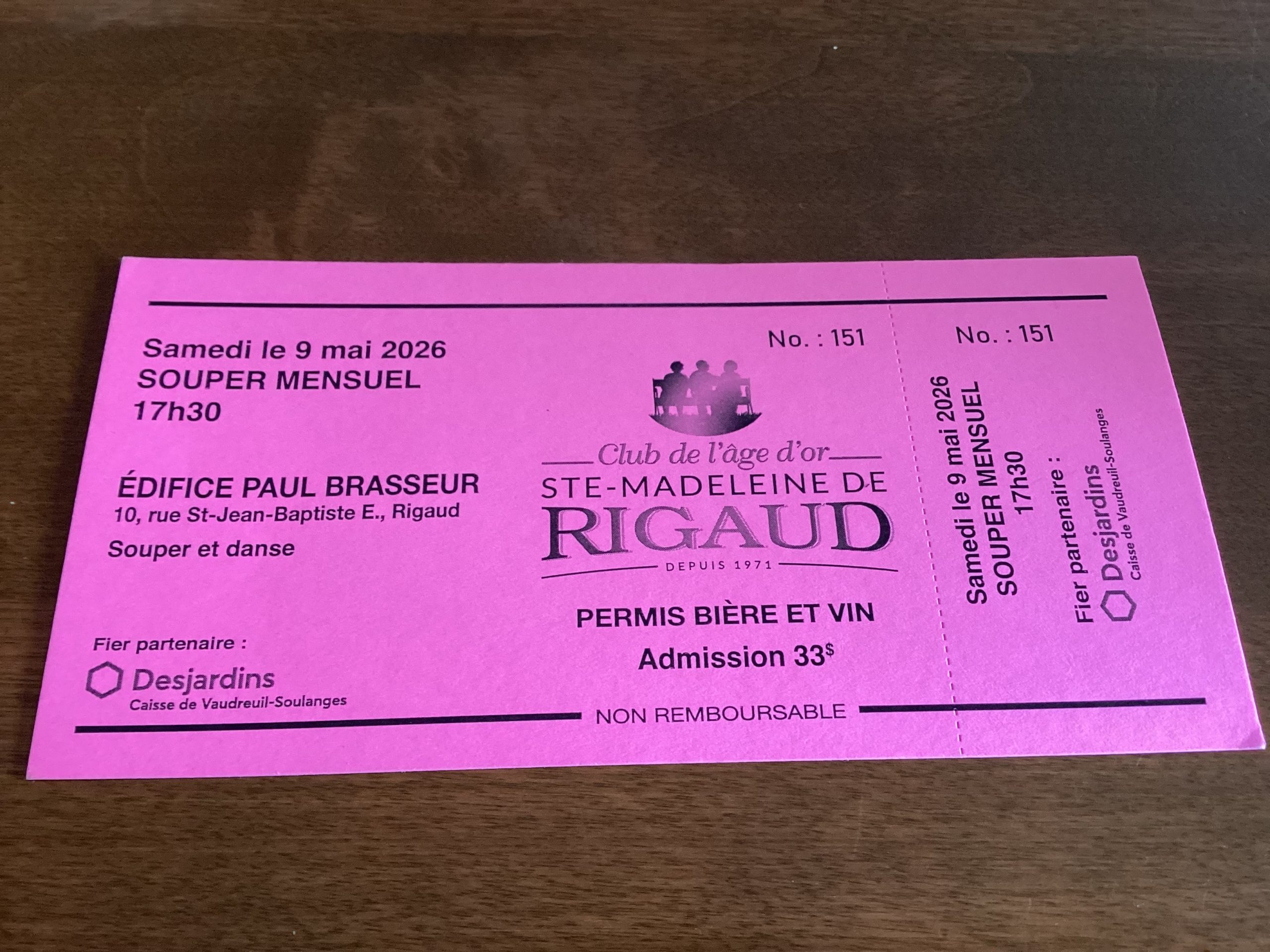 Notre prochain souper est prévu pour samedi 9 mai 2026 à compter de 16h00 à l’édifice Paul Brasseur (salle de l’Amitié) situé au 10 rue St-Jean-Baptiste à Rigaud.