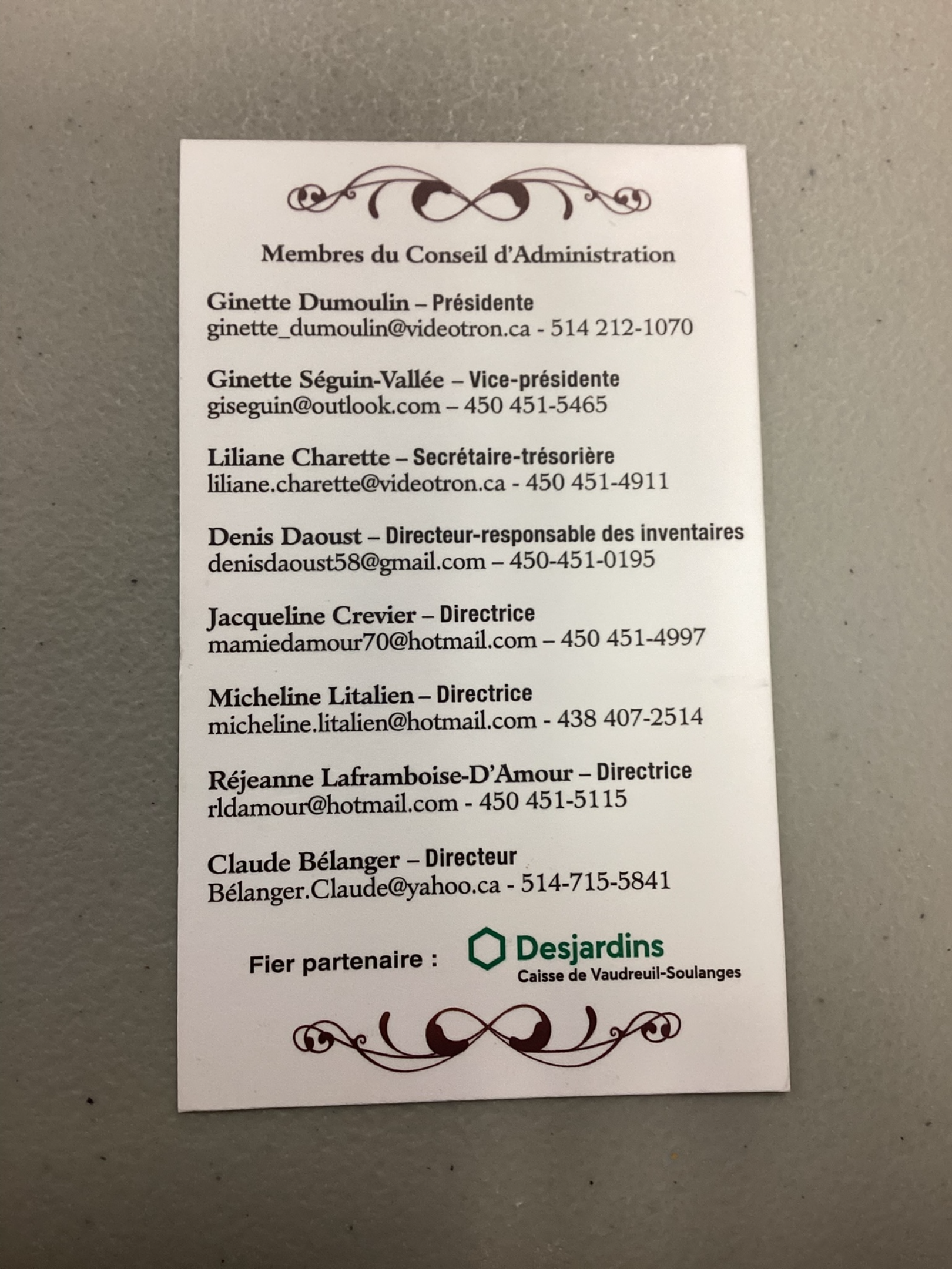 Vous devez communiquer vos coordonnées avec l’un de administrateurs (voir le petit carton avec les noms des administrateurs) pour réserver votre souper et vous devez obligatoirement être membre pour participer à nos activités et la carte de membre ne coûte que $5.00.