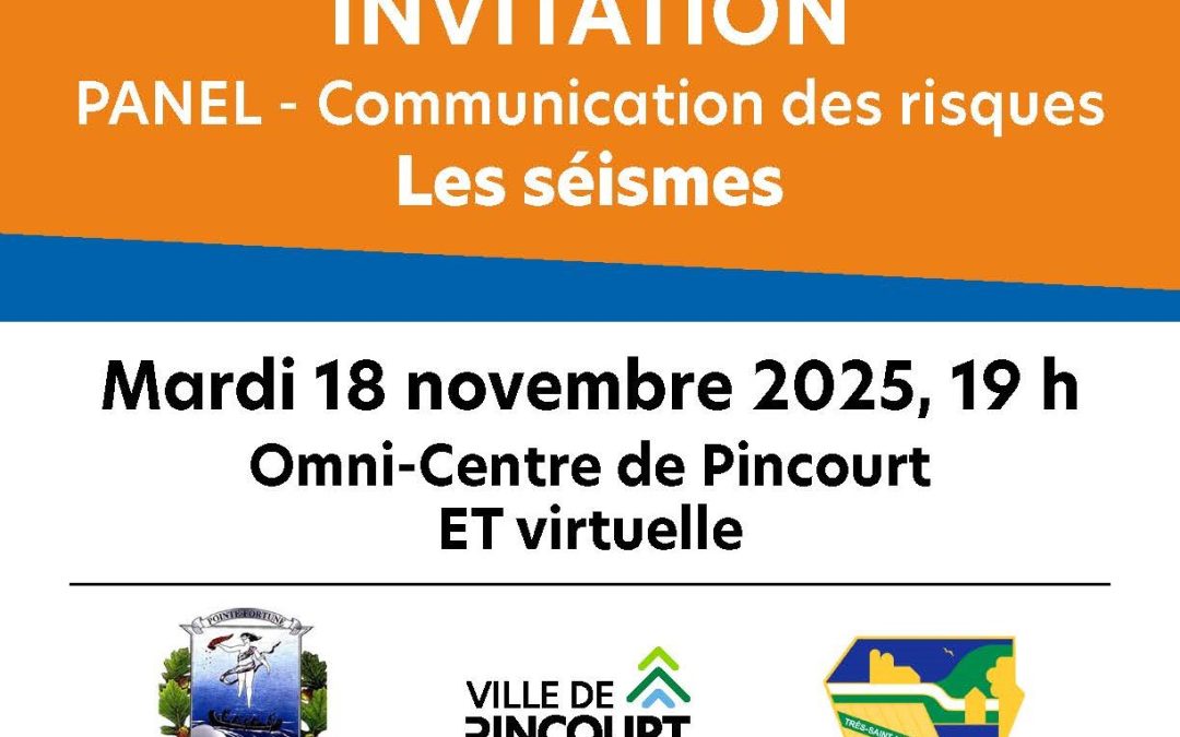 Dans un esprit de résilience collective, les municipalités de Pincourt, Très-Saint-Rédempteur et Pointe-Fortune invitent leurs citoyen.ne.s, le mardi 18 novembre 2025 à 19 h, à prendre part au panel de communication des risques en sécurité civile axé sur les séismes.